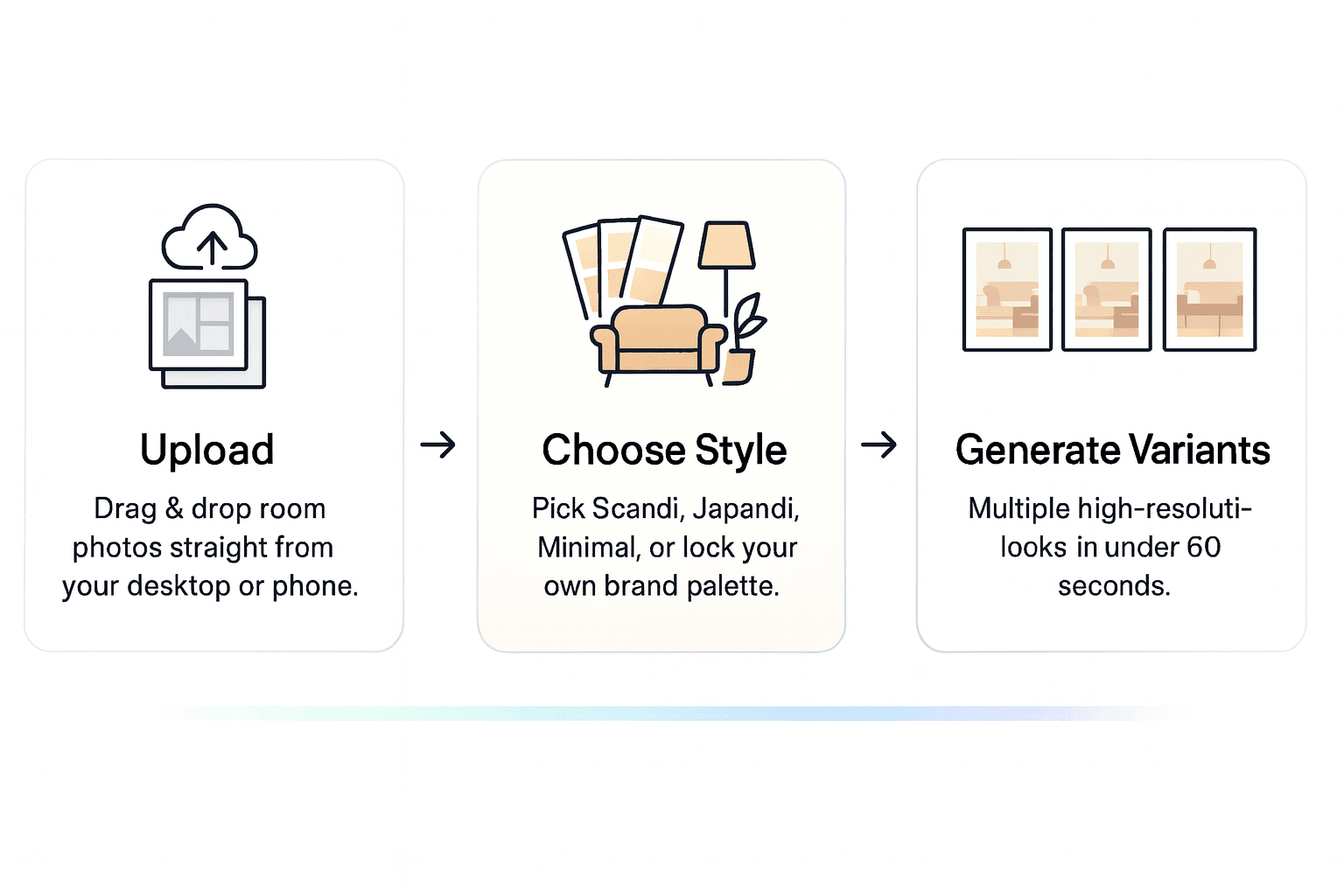 Our AI keeps walls, windows, doors, and proportions true to life while refreshing colours, materials, lighting mood, and furnishings. Use alongside the originals and clearly label as concept visuals.